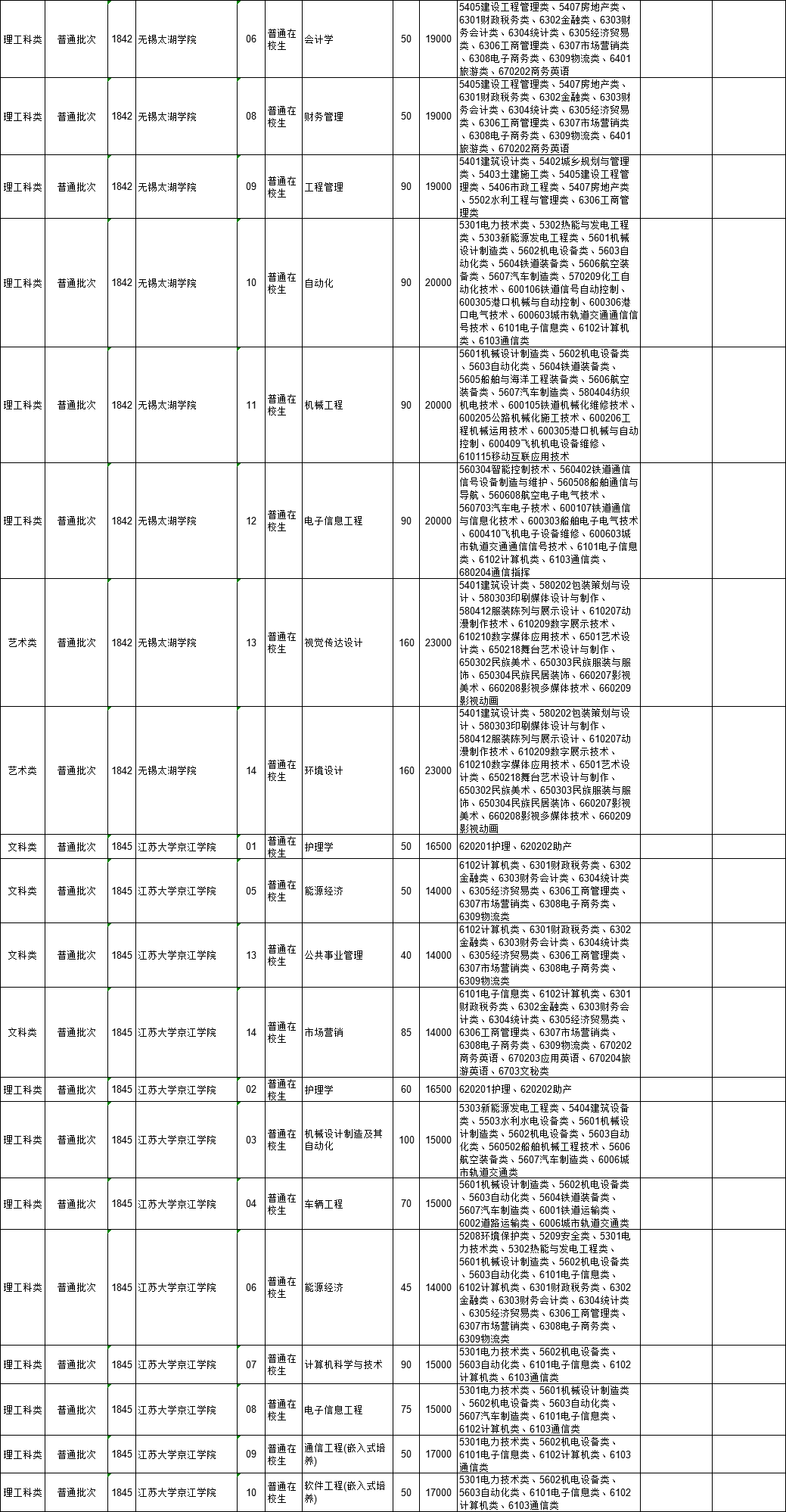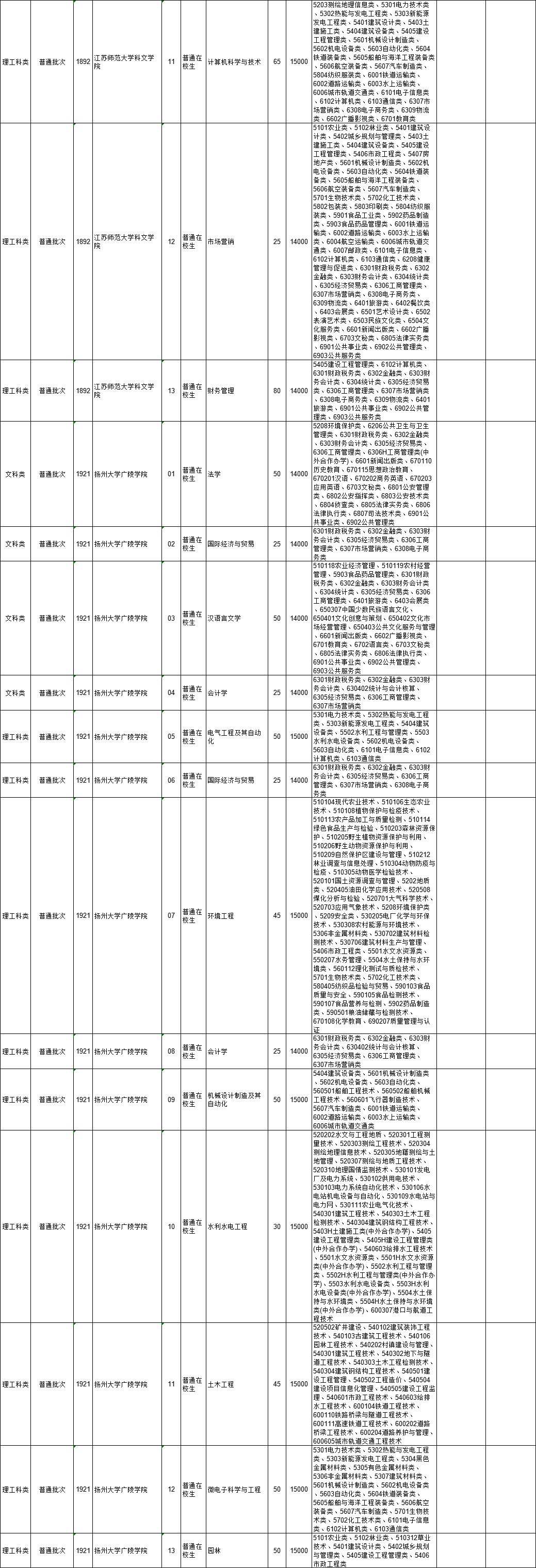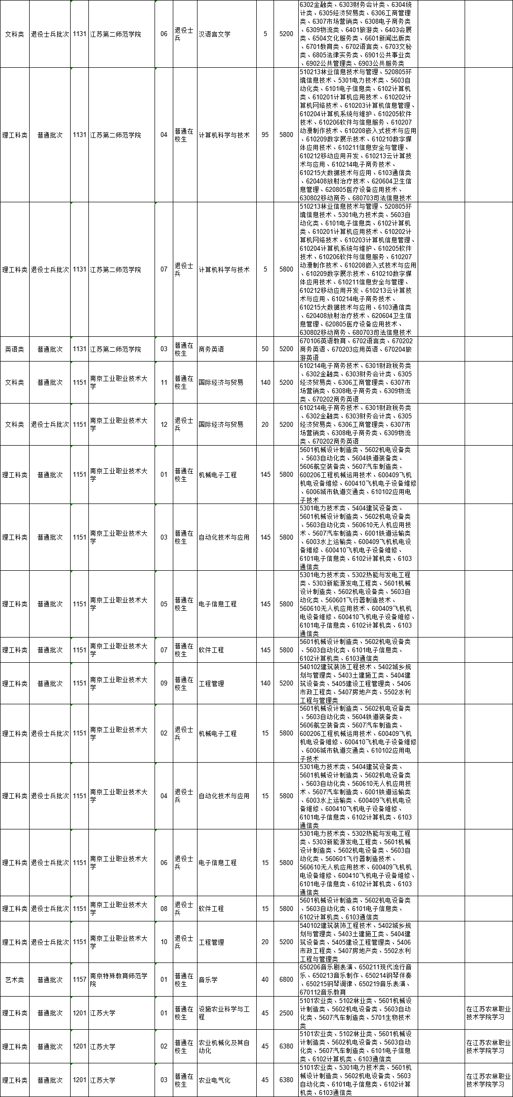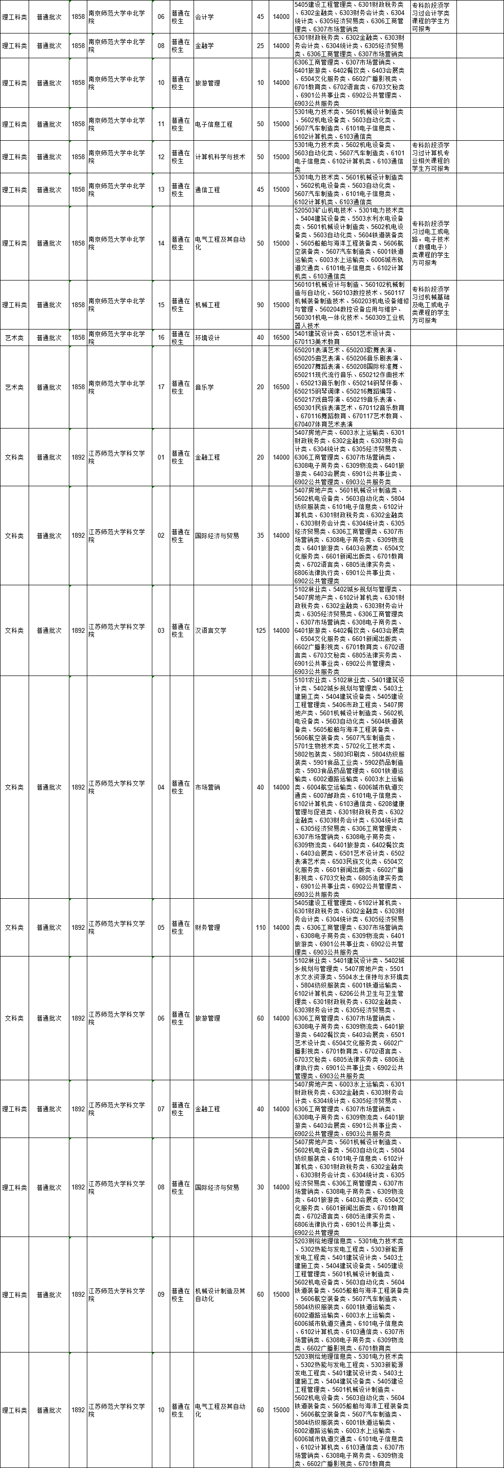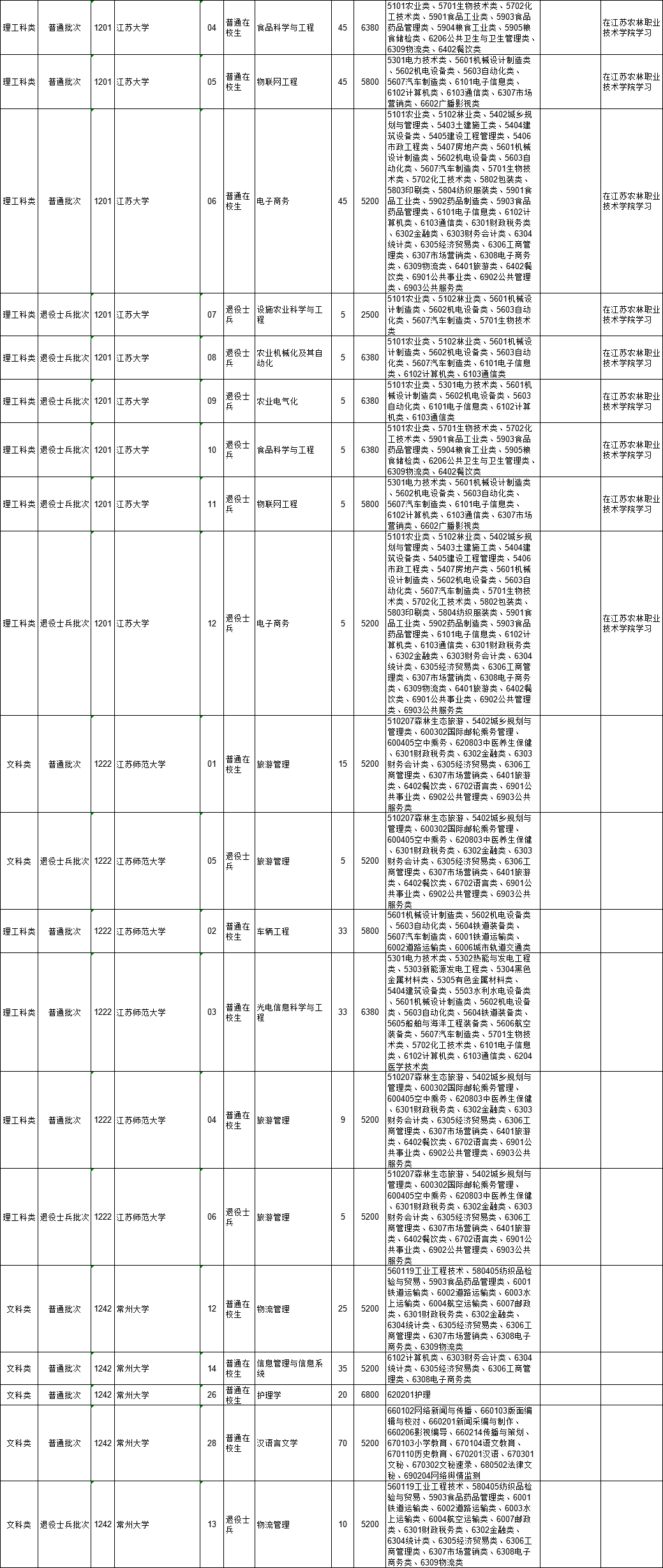 2021年江苏省普通高校“专转本”专业计划表(按报考类别排列)
