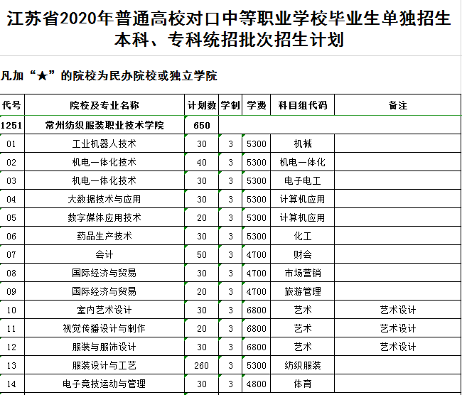 常州纺织服装职业技术学院2020年对口单招招生简章