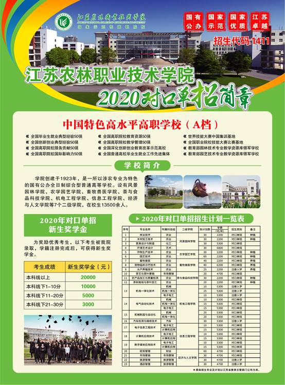 江苏农林职业技术学院2020年对口单招招生计划