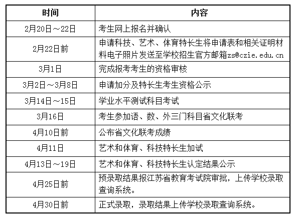 2.艺术、体育和科技特长生需参加2020年江苏省高职院校提前招生正常报名,并在2020年2月22日之前,将《常州工程职业技术学院2020年高职院校提前招生艺术体育科技特长生申请表》和相关证明材料电子照片发送至学校招生官方邮箱zs@czie.edu.cn,同时需参加省文化联考。