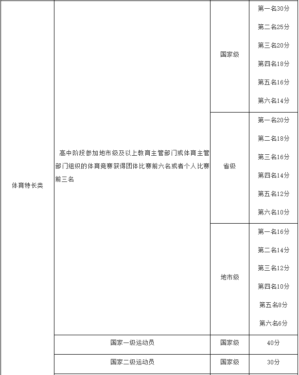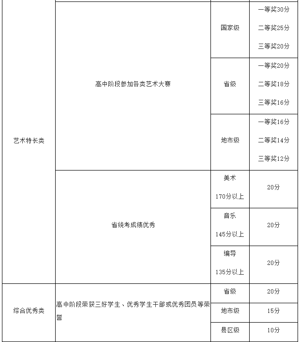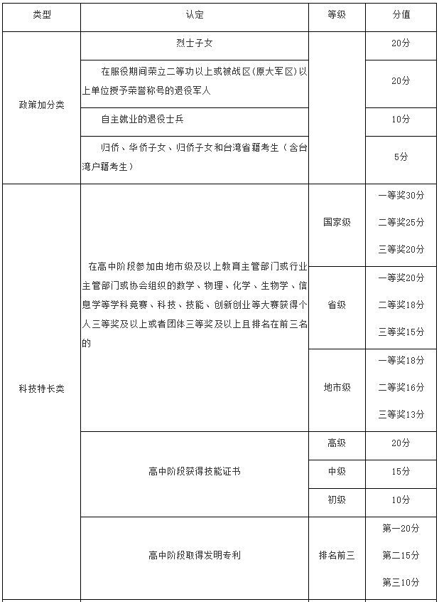 加分政策。凡符合下列条件的考生可申请加分。各类荣誉认定及赋分标准见下表: