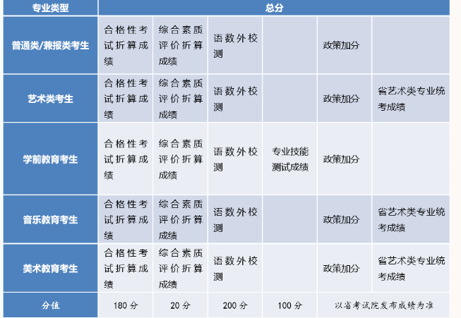 总分=合格性考试折算成绩+考生综合素质评价折算成绩+综合素质测试成绩+政策加分+省艺术类专业统考成绩+专业技能测试(面试)成绩。