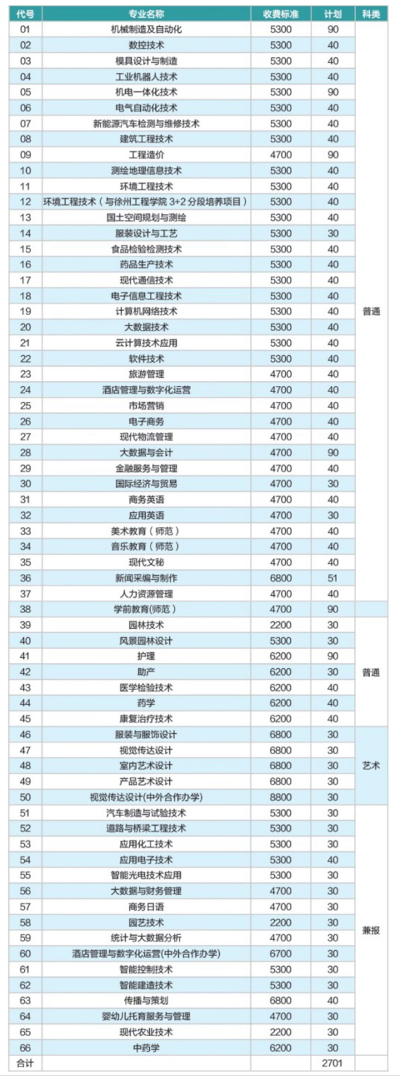以“分数优先、遵循志愿”原则录取。结合志愿填报考生数和考生总分,分类划定学校最低控制分数线(兼报类单独划线)。限额专业录取:环境工程技术(与徐州工程学院分段培养项目)专业、师范类专业(学前教育、美术教育、音乐教育)、医学类专业(护理、助产、医学检验技术、药学、康复治疗技术)在录取时,根据上线考生数和考生总分,划定专业最低控制分数线。