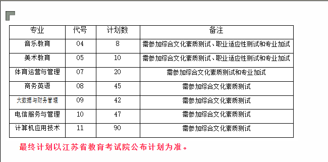 报考音乐教育、美术教育、体育运营与管理专业的考生须参加相应专业的专业加试。专业加试每项总分为100分,低于60分为不合格,不合格的考生将不得录取相关专业。已经取得省艺术类考试成绩的考生,专业加试免试,专业加试成绩计为合格。专业加试成绩不计入职业适应性测试总分。