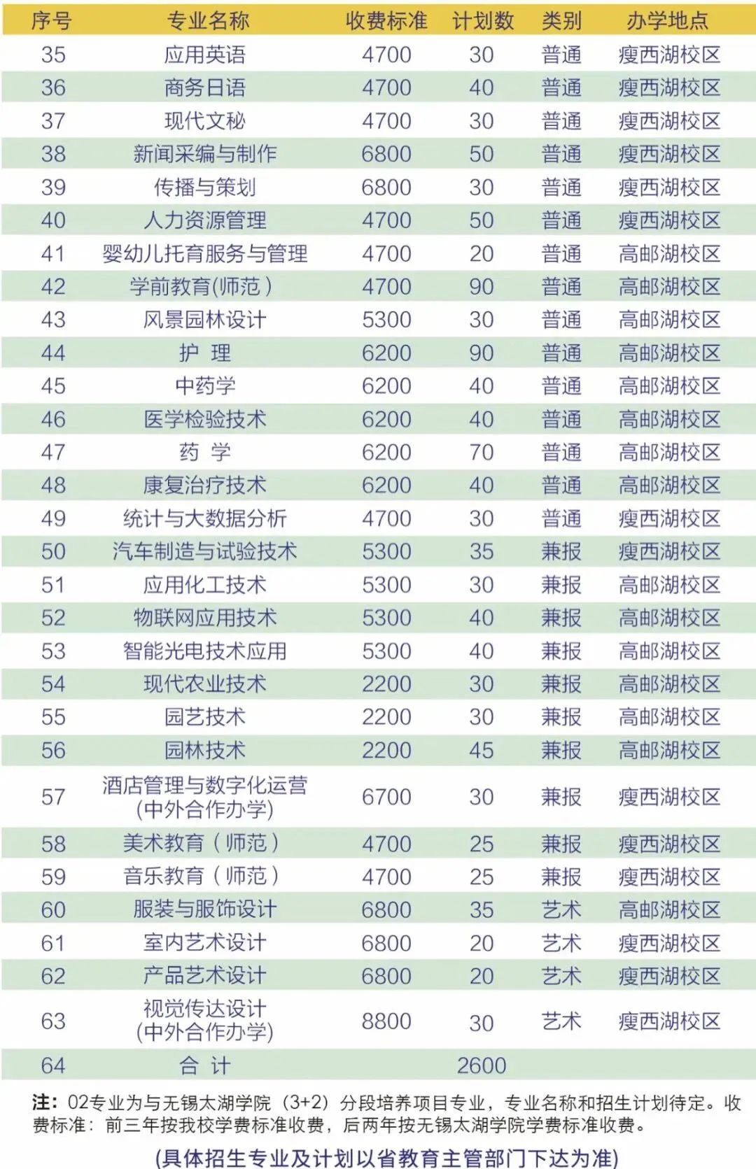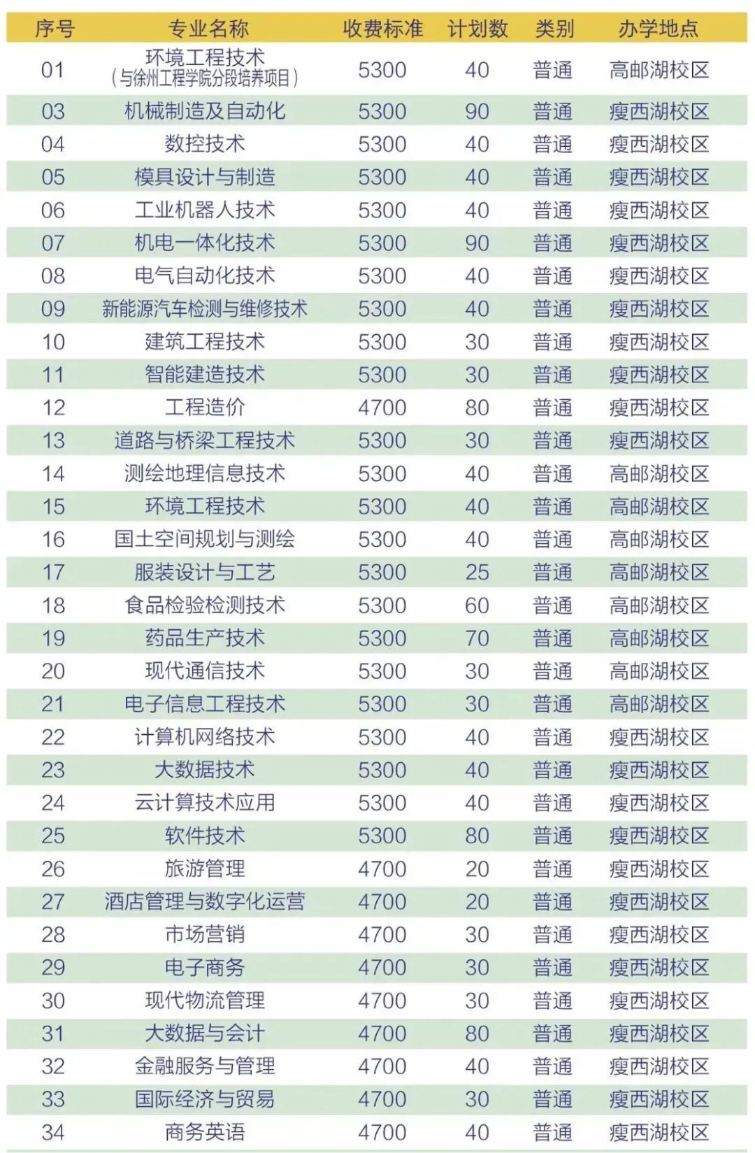 扬州市职业大学提前招生计划一览表