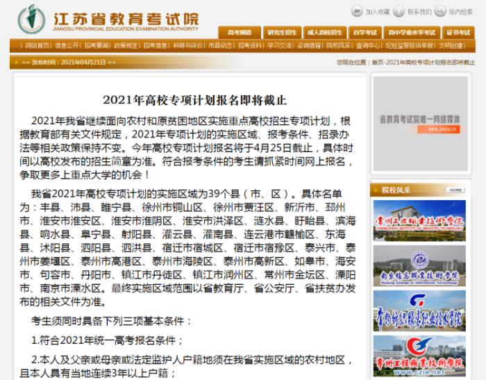 2021年我省继续面向农村和原贫困地区实施重点高校招生专项计划,根据教育部有关文件规定,2021年专项计划的实施区域、报考条件、招录办法等相关政策保持不变。今年高校专项计划报名将于4月25日截止,具体时间以高校发布的招生简章为准。符合报考条件的考生请抓紧时间网上报名,争取更多上重点大学的机会!
