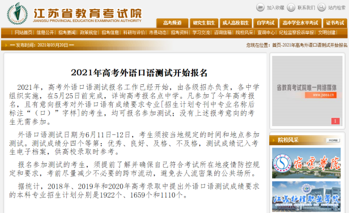 2021年,高考外语口语测试报名工作已经开始,由各级招办负责,各中学组织实施,在5月25日前完成,详询高考报名点中学。凡参加了今年高考报名,且有意向报考对外语口语有成绩要求专业[招生计划专刊中专业名称后标注“(口)”字样]的考生,均可报名参加测试;没有上述报考意向的考生无需参加。