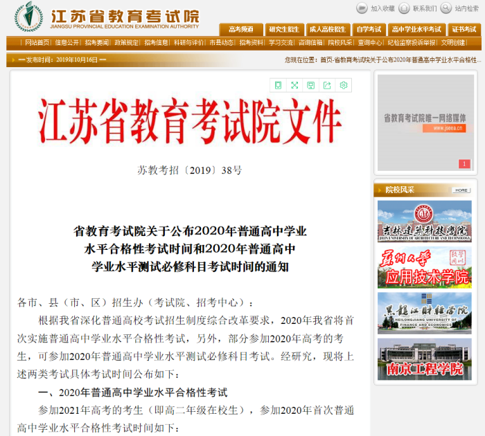 省教育考试院关于公布2020年普通高中学业