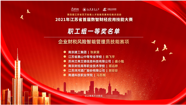 2021年12月11日,江苏省首届数智财经应用技能大赛决赛圆满落下帷幕。经过激烈角逐,我校马苏湘老师在“企业财税风险智能管理员技能”赛项中荣获一等奖,依据相关激励政策被授予“江苏省技术能手”称号。