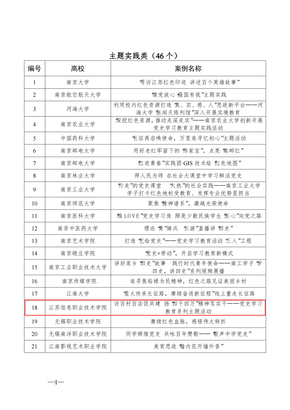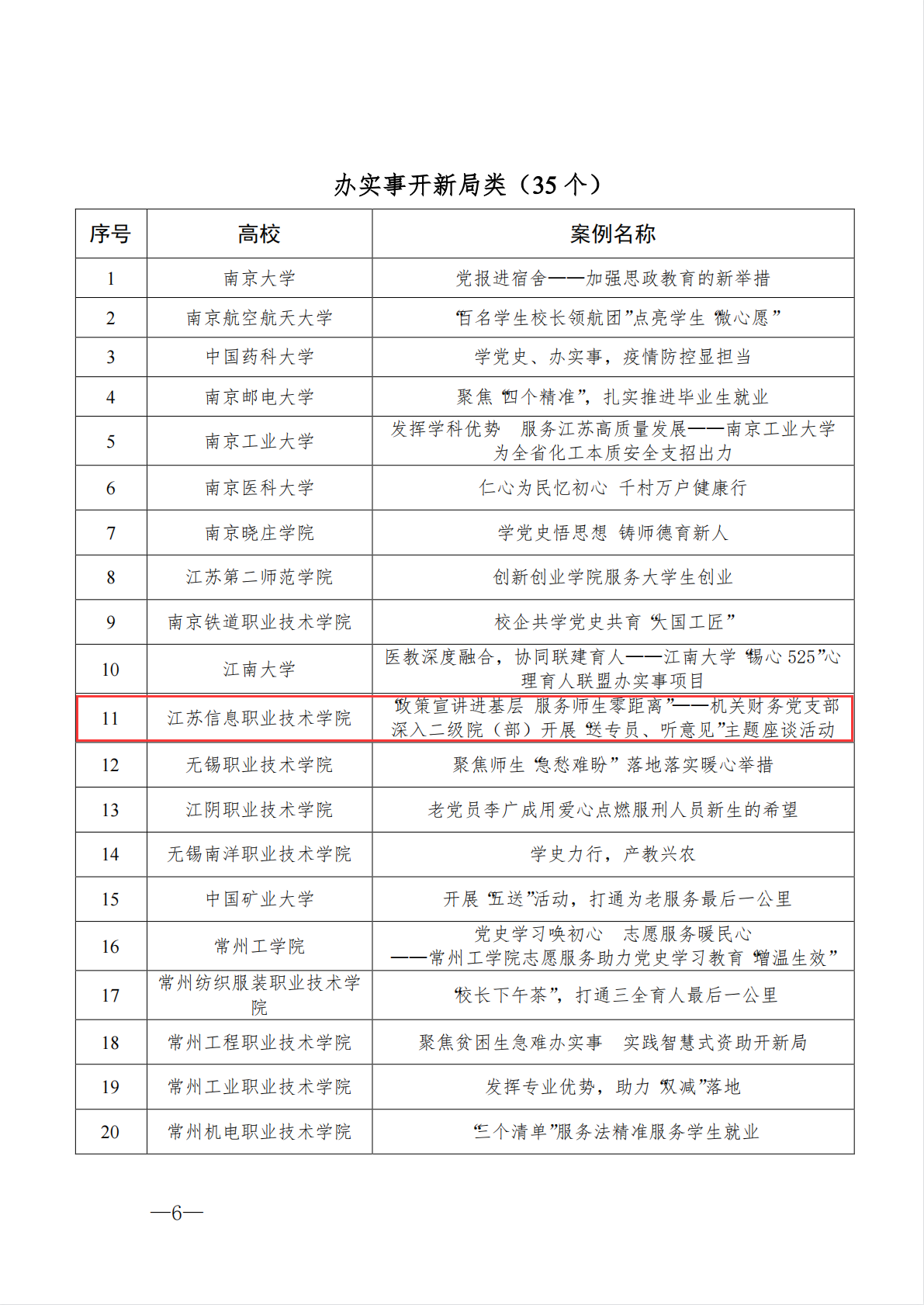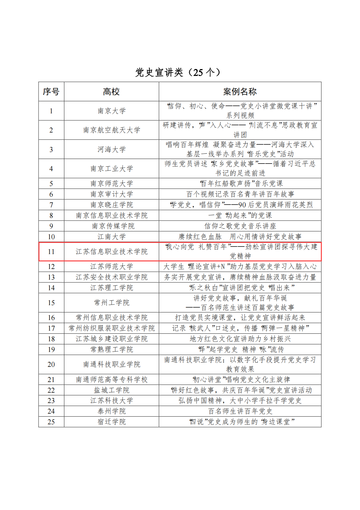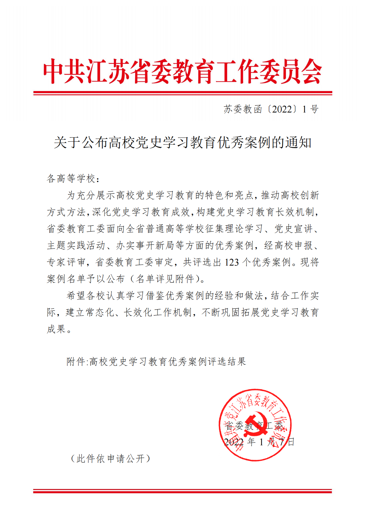 1月7日,中共江苏省委教育工委发布《关于公布高校党史学习教育优秀案例的通知》(苏委教函〔2022〕1号),我校共有3个案例获奖。获奖数位居所有获奖高校前列。