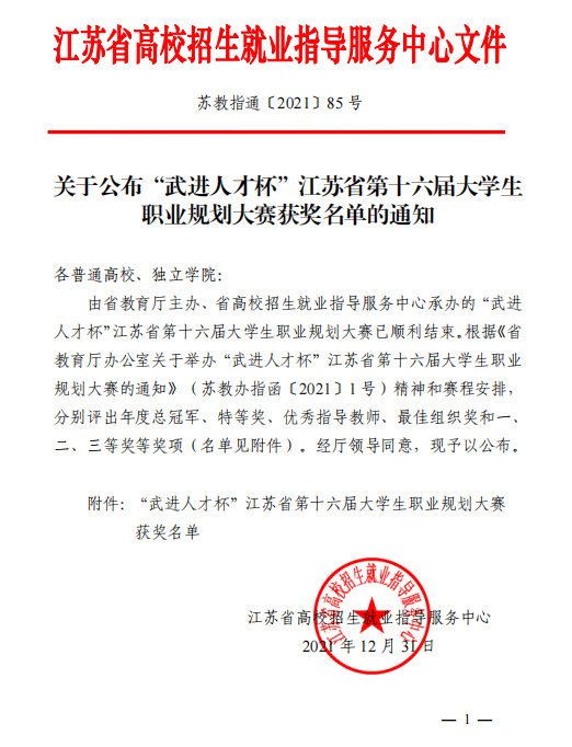 近日,由江苏省教育厅主办、江苏省招生就业指导服务中心承办的“武进人才杯”江苏省第十六届大学生职业规划大赛总决赛隆重举行。我校荣获二等奖1项,三等奖2项。
